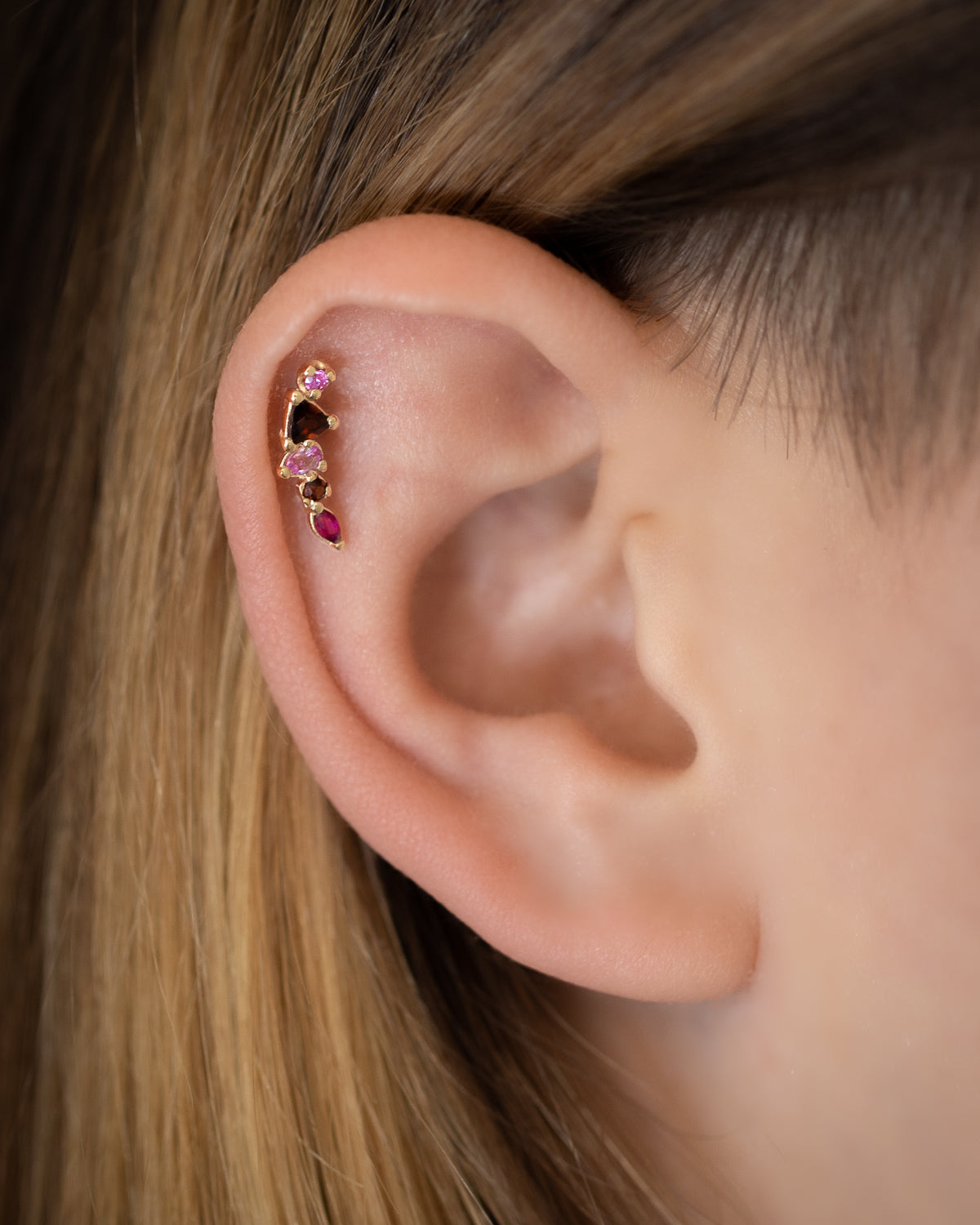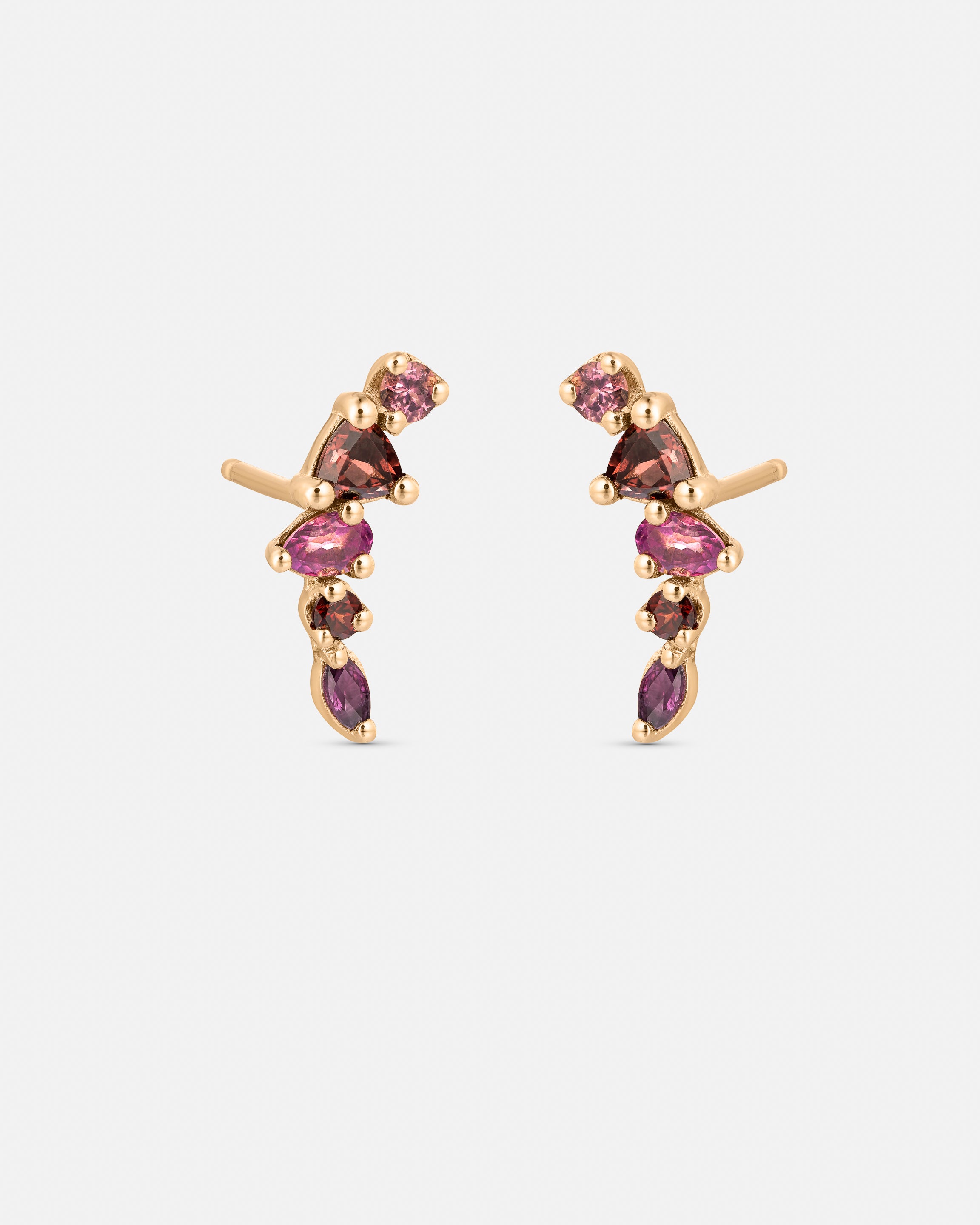 The Roze Earring is the pinnacle of our stud collection, featuring an array of pink sapphire, tourmaline, ruby and garnet.