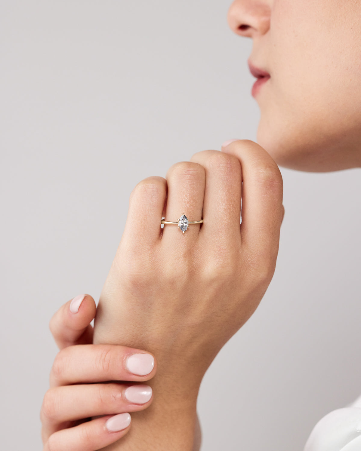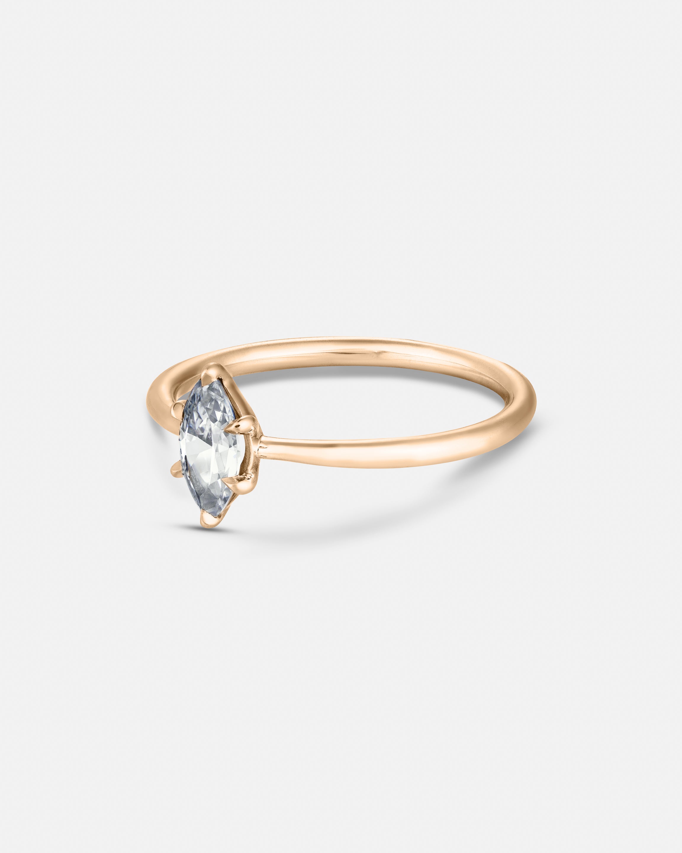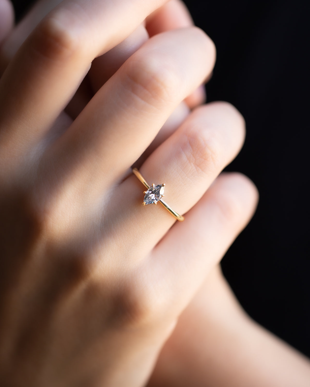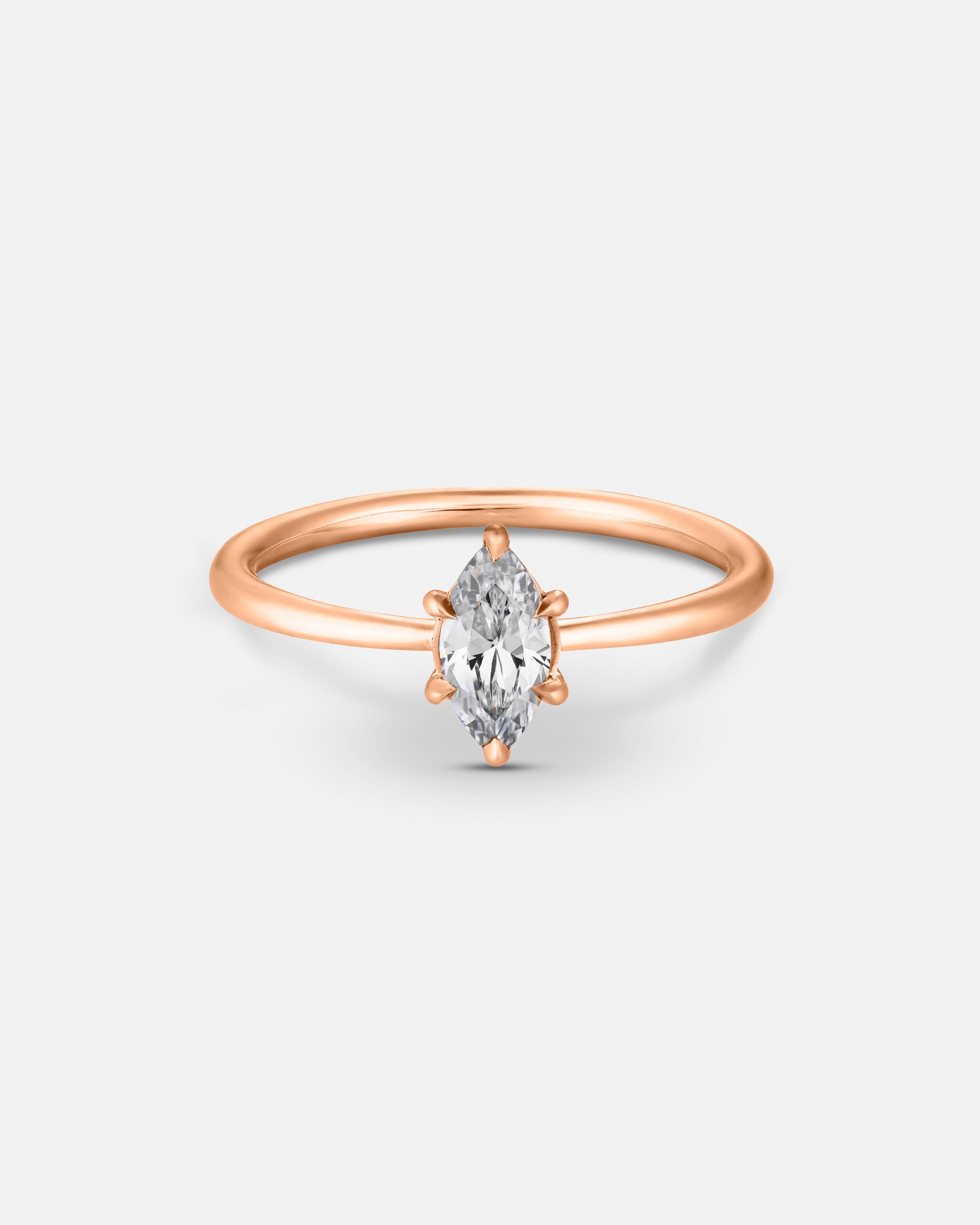 The Marquise Engagement Ring, a nod to regal elegance and designed to elongate and flatter the hand. The distinctive boat-shaped diamond, with its pointed ends and curved sides, radiates with a fiery brilliance.