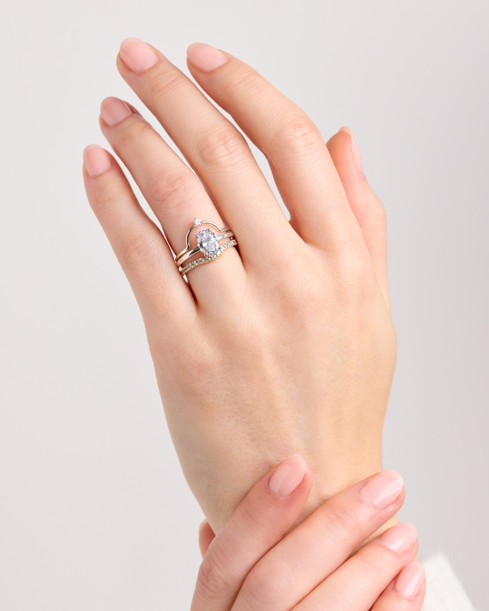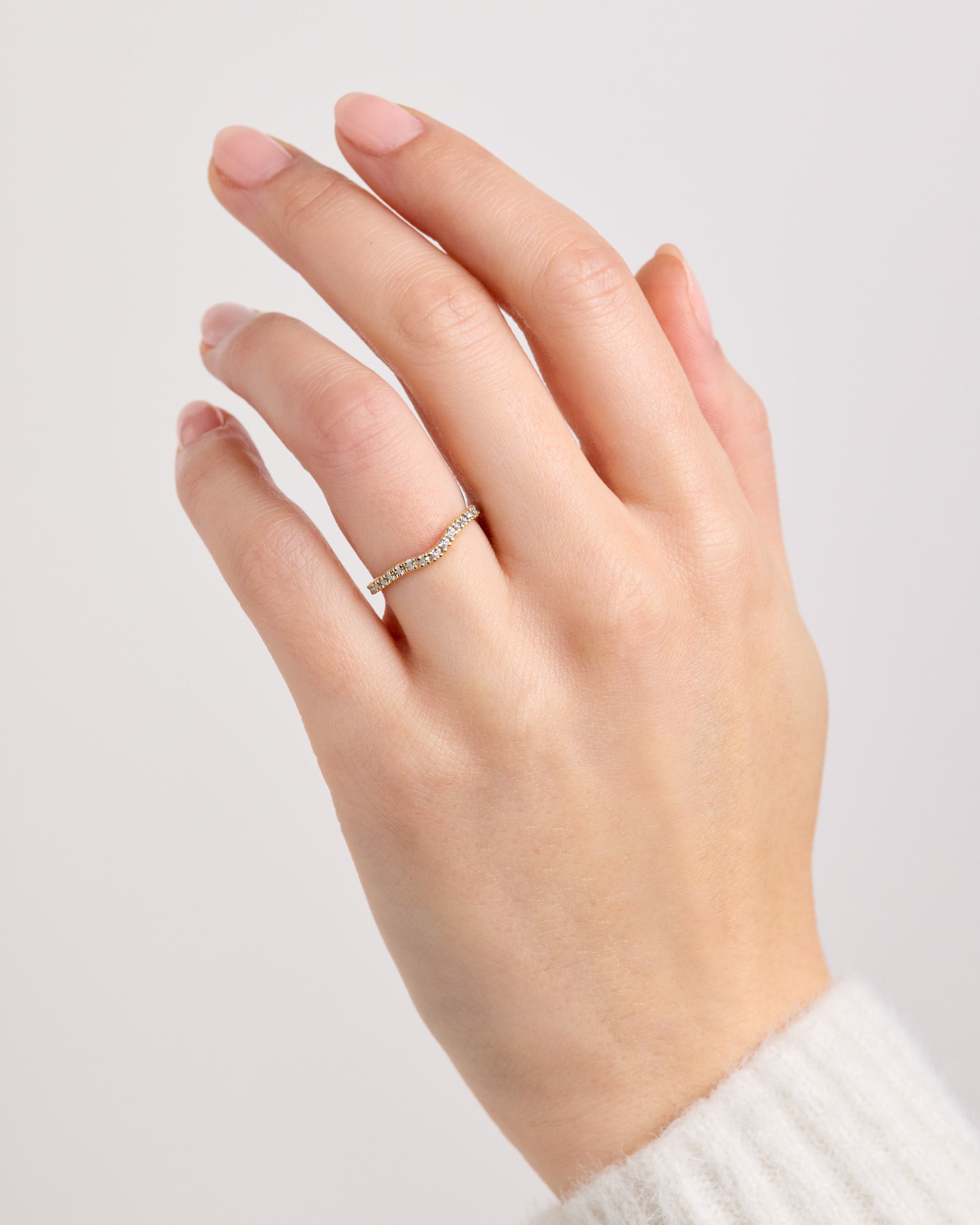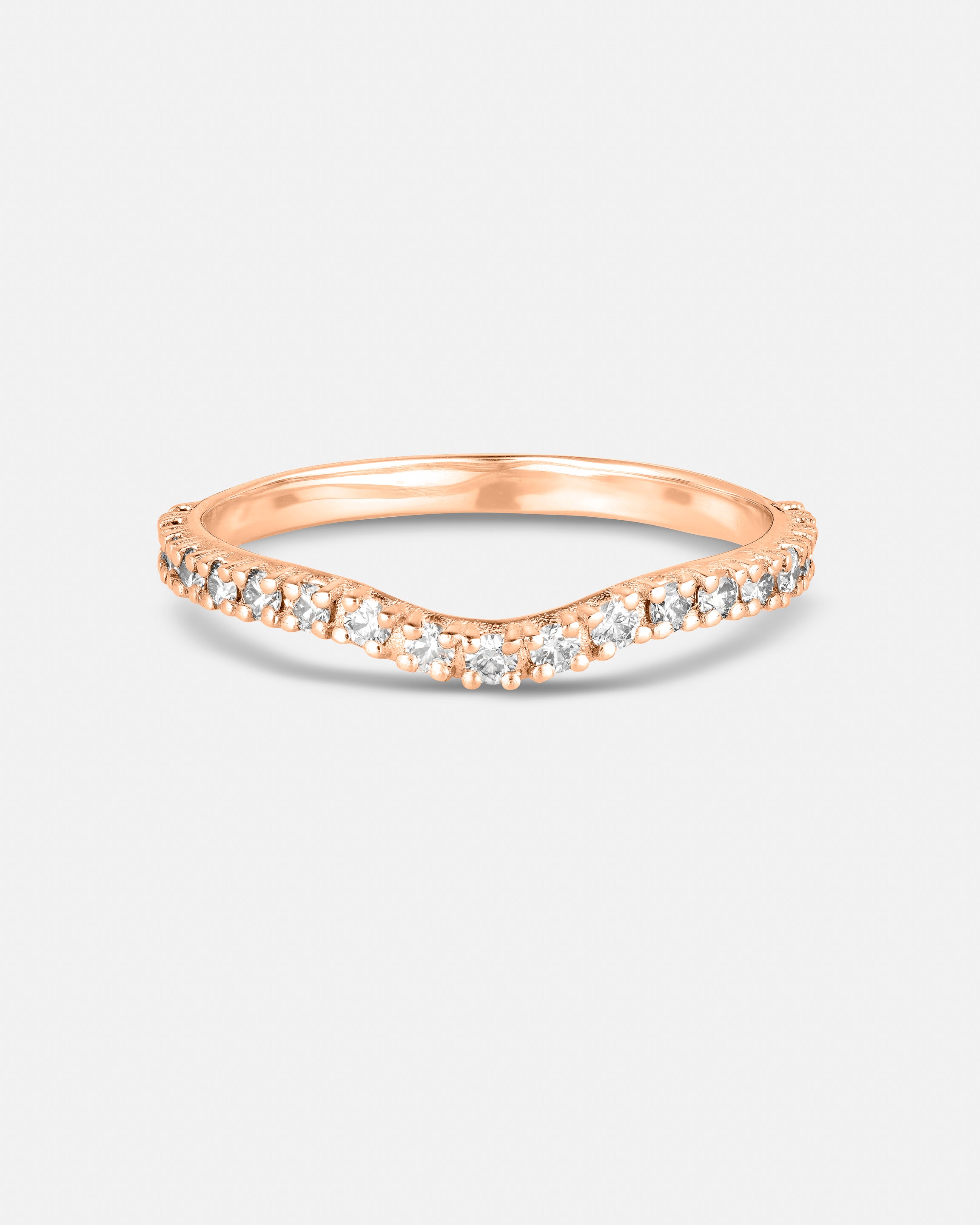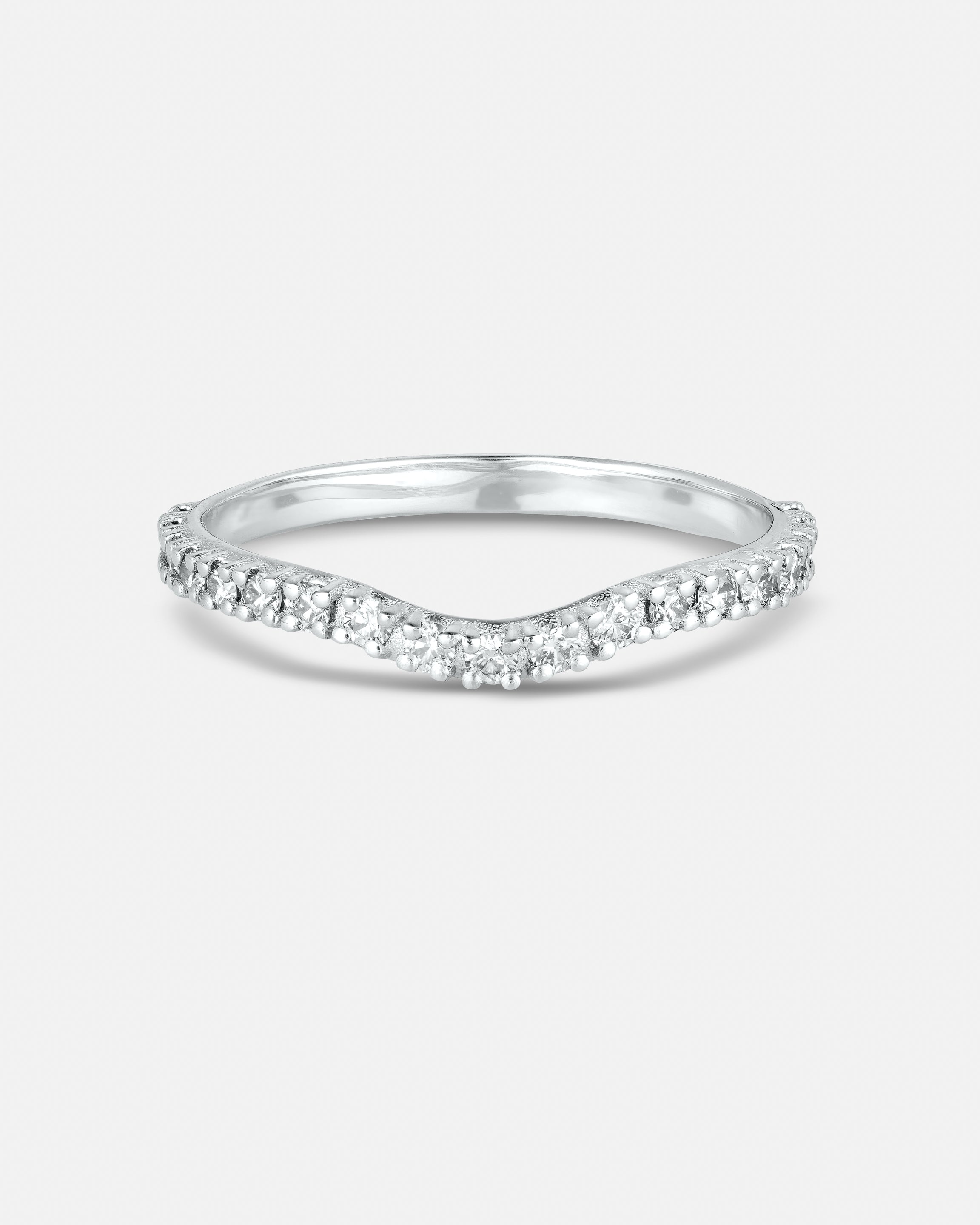 The Curved Eternity Band is a delicate diamond band with a gentle curve, designed to sit gracefully alongside an engagement ring or shine on its own.