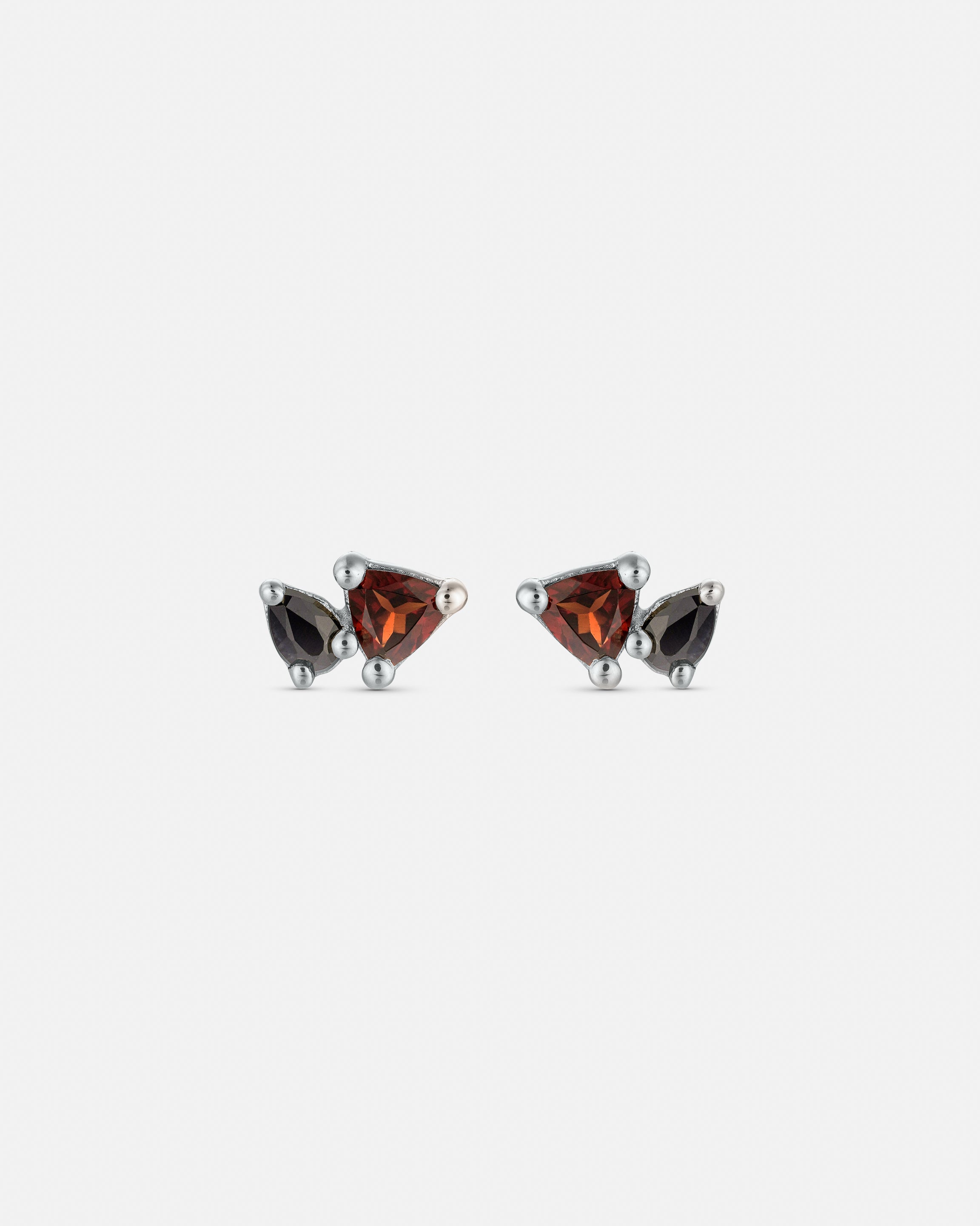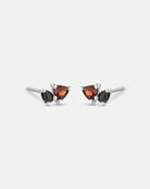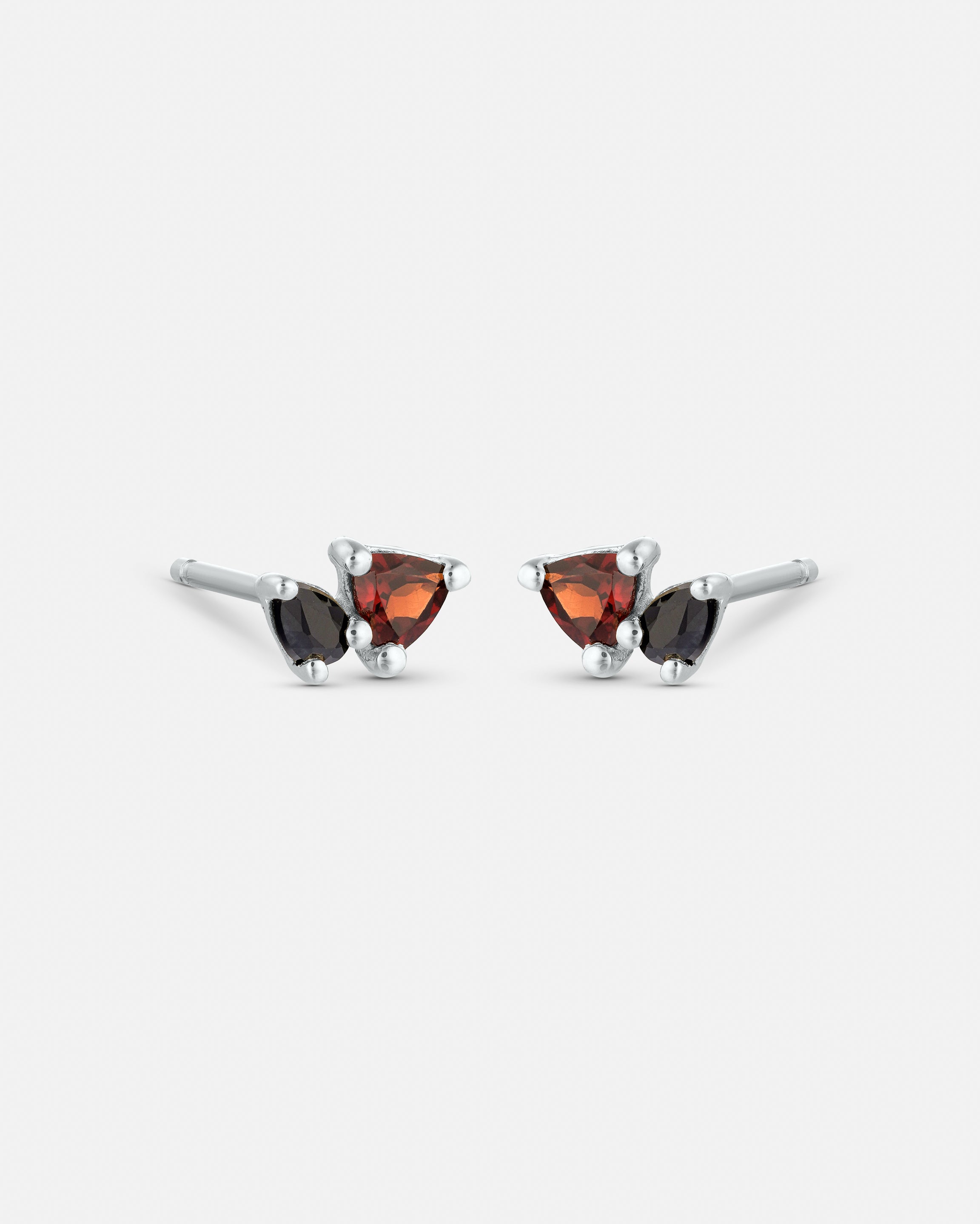 The Par Earring is an understated, asymmetrical pairing of darkly toned Australian black sapphire and garnet.